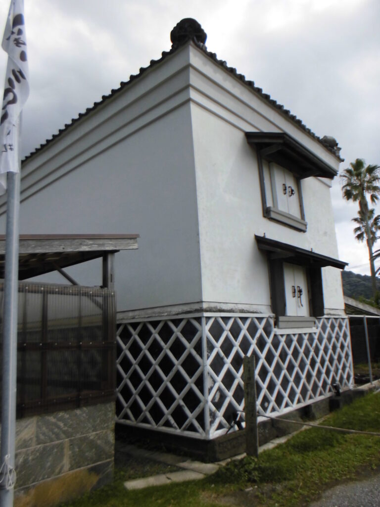 黒っぽく見える小さい蔵は後ろの大きい白い蔵の入口になっている。後ろの大きい方は、房州石の上に白い漆喰を塗っている。前の小さい方は桜目石という最高級のきれいな石を使っているので、石の地肌を見せている。反対側、南の面には大きなこて絵が見えている。テレビでこのこて絵(壁塗りのこてで描く絵)の製作を放送していた。淡路島から来てもらった職人ということであった。写真は白い蔵をぐるっと回って撮っている。