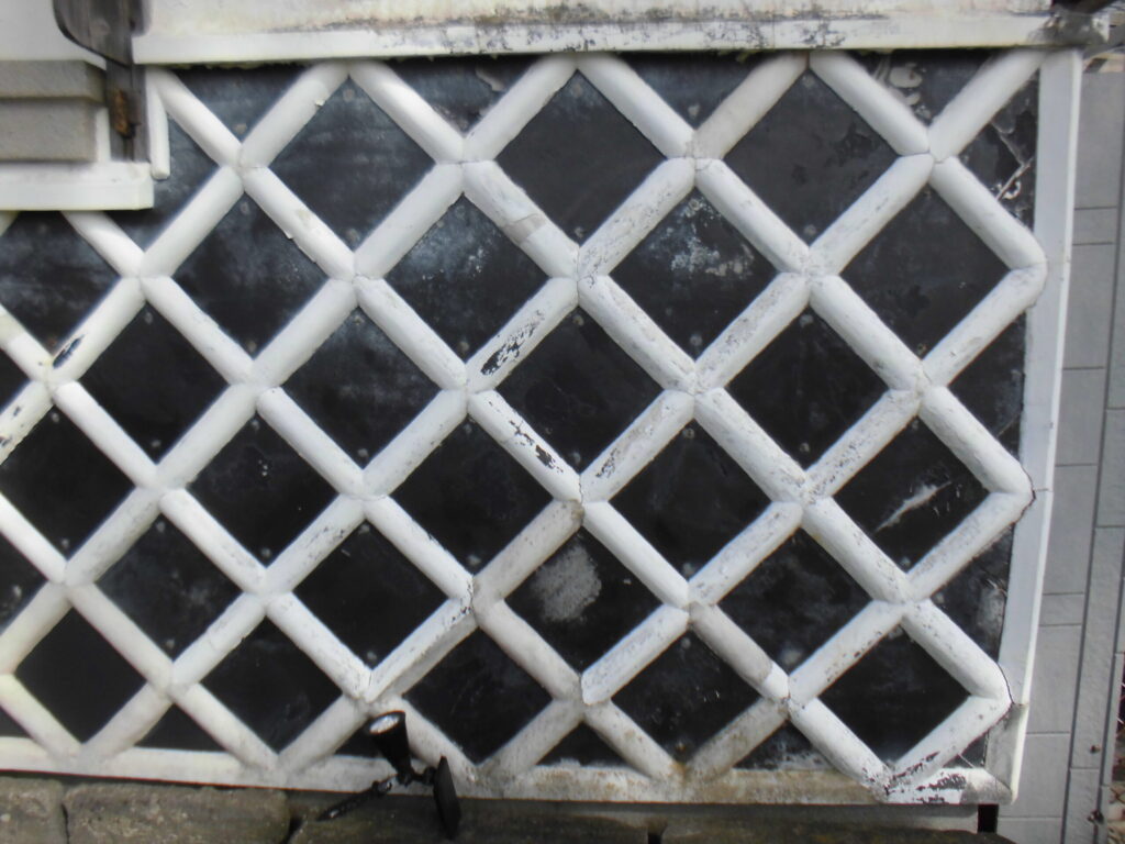 上の写真は、左がなまこ壁です。真ん中の黒い部分は平瓦が入っています。瓦の周りを白い漆喰で止めています。この漆喰がなまこのように見えるのでしょう。蔵の足元が濡れるのを防ぐためですが、大変美しいデザインだと思います。