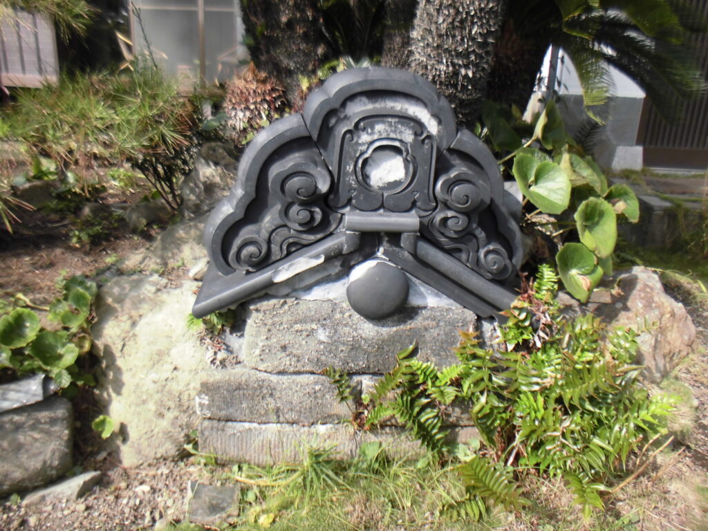 上の写真は重要な写真なので、大きくしています。桜目石のきれいな地肌が見えています。しかし、それより重要なのは瓦です。この瓦どこが重要だかわかりますか。あなたの家の瓦と比べてください。丸いところが違うんです。スパッと切り落としたような平面になっています。その後の時代の瓦は凸レンズのようなふくらみがあります。このような平面の瓦を無地瓦といいます。