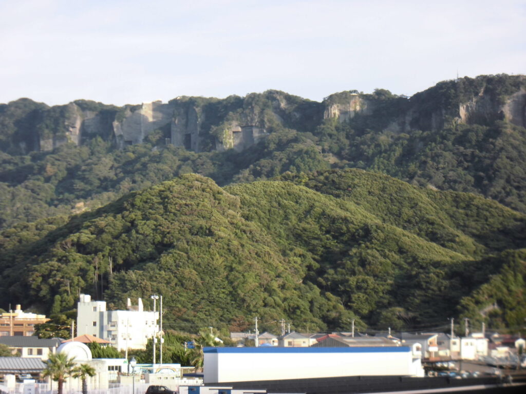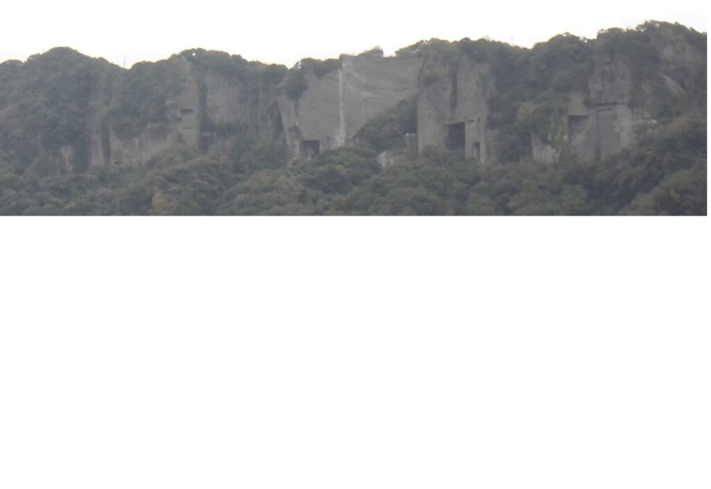 鋸山の遠景である。手前側の業者と山向こうの業者が、それぞれ切っていったので、山はどんどん薄くなってゆき、一番薄いところは1メートルくらいしかないという話であった。石は山頂から、自分の足元の石をつるはしで切るので、どんどん下へ下がって行くそうです。それであのようなまっすぐな、切立った壁面になるそうです。岩脈は斜めなので、場合によっては、周囲にできる壁の方に切り進むこともあり、技術的に難しいそうです。大谷石では、1個80kgの石を切り出すのに3600回つるはしを振るったといいますから、房州石も同じくらいの重さ硬さだったので、大へんな重労働だったでしょう。これをネコ(一輪車)に3本のせ、ふもとに運んだのが女性の仕事であった。