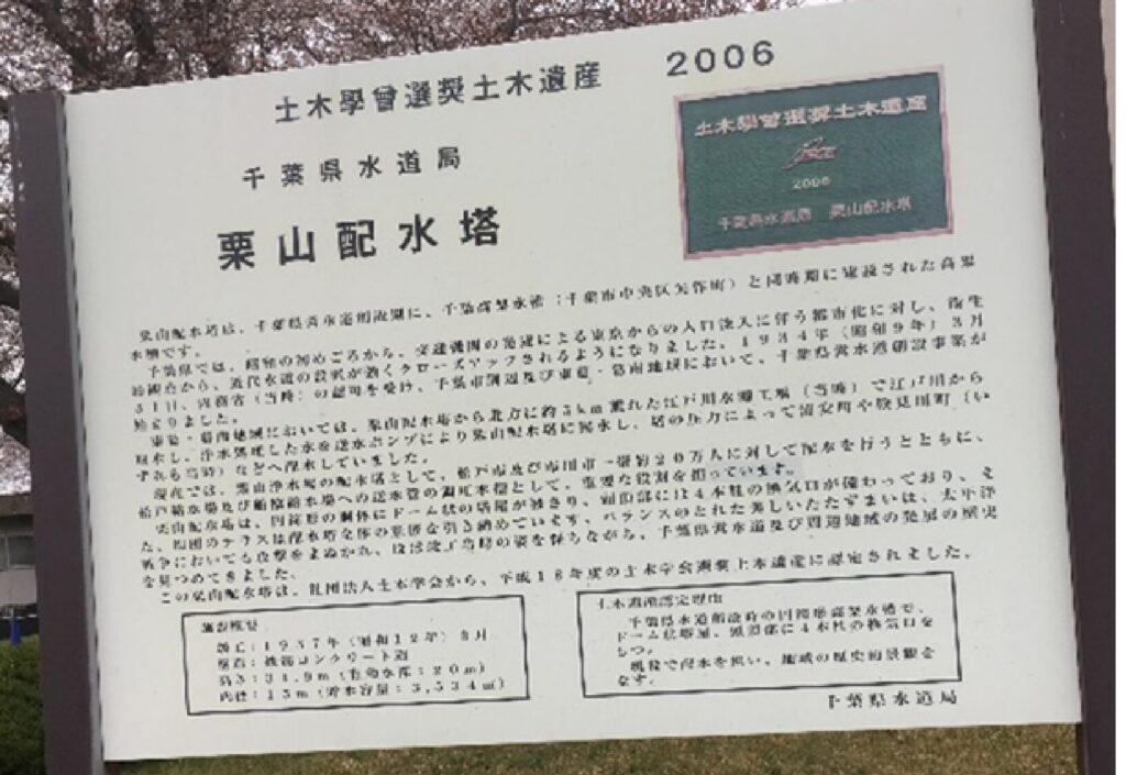 昭和15年に給水を開始した千葉県水道事務所江戸川水源工場(現:栗山浄水場)の付帯施設として建設された円筒型高架水槽